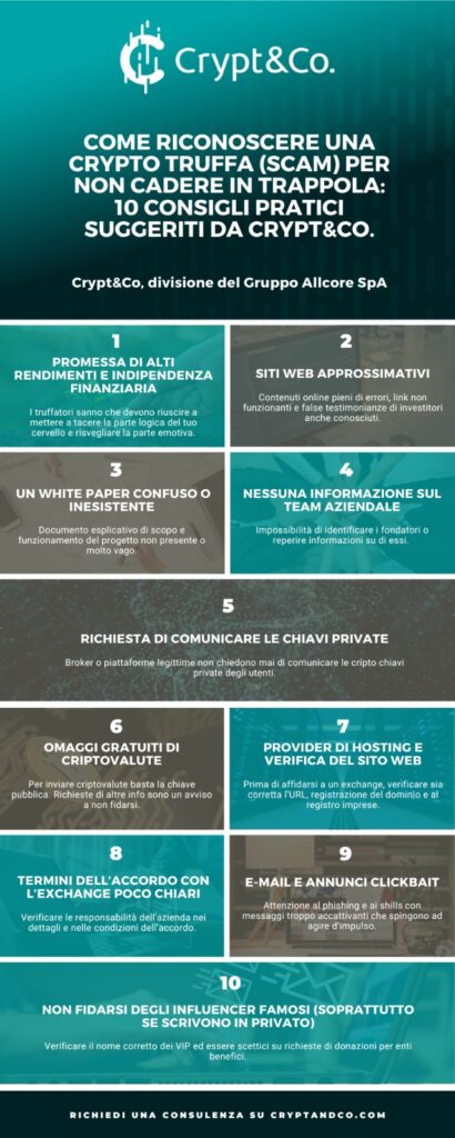 L’unico modo per evitare di perdere i propri soldi, quindi, è essere prudenti e imparare a riconoscere una truffa. Ecco allora 10 consigli pratici per non cadere nel tranello suggeriti da Crypt&Co, divisione del Gruppo Allcore SpA che offre consulenza legale e fiscale in ambito crypto.